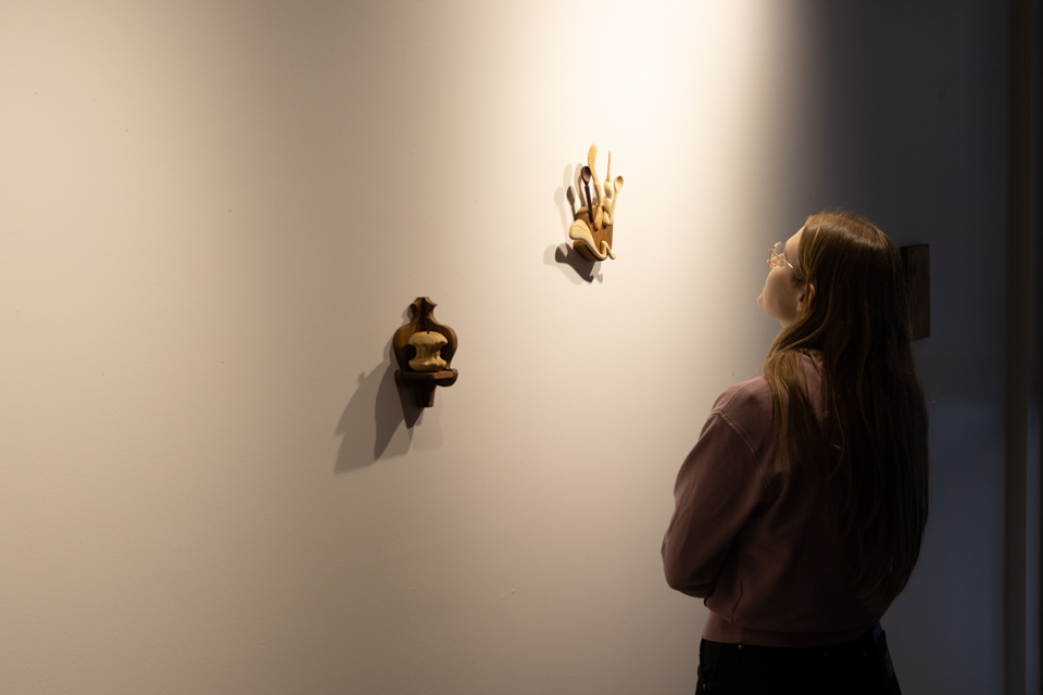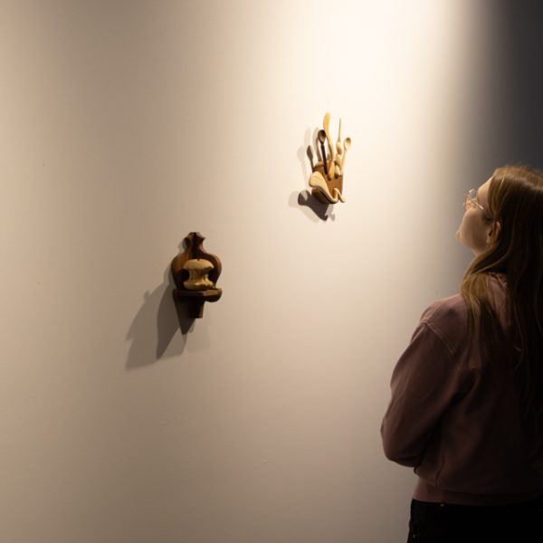 We discovered sweet cigarette packs, ceramics on unusual pedestals, a gnawed wooden apple, a model of an oversized hat, and an excerpt from a book consisting entirely of lists.
